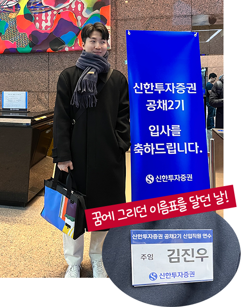 어쩌면 제겐 최종 합격보다, 인턴 합격 소식이 더 기뻤던 것 같습니다. 이공계생인 저에게 금융은 완전히 낯선 분야였기에, 첫발을 내딛는 경험 자체가 너무나 간절했거든요. 인턴 합격 문자를 받던 순간, 함께 있던 아버지도 저만큼 소리를 지르시면서 기뻐해 주셨던 기억이 아직도 생생합니다. 그렇게 저는 2023년, 인생에서 가장 뜨거운 여름을 신한투자증권에서 보냈고 그해 겨울, 신한투자증권 공채 2기로 입사하게 되었습니다.