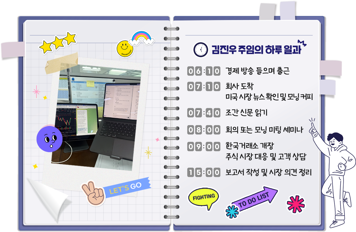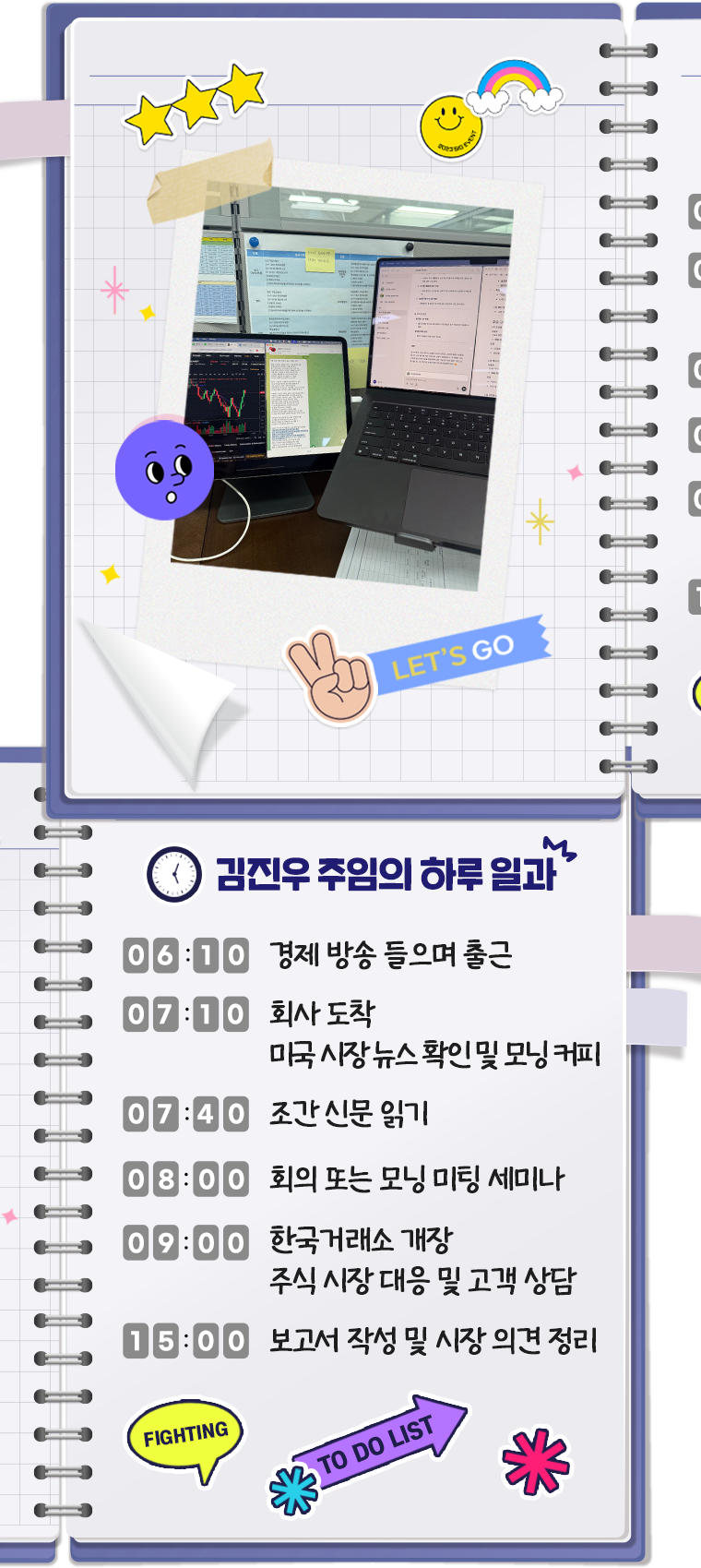 대학에서 바이오·신소재를 전공했지만, 주식과 경제 뉴스를 들여다보는 시간이 더 즐거웠습니다. ‘세계 경제의 흐름을 읽고, 다양한 산업의 추세를 살피며 내일을 예측하는 일이 직업이 된다면 얼마나 행복할까?’ 그런 생각이 마음속에 자리 잡았습니다. 그래서 금융이라는 새로운 세계에 도전하기로 결심했습니다. 하고 싶은 일을 하면서 살아가고 싶었거든요.