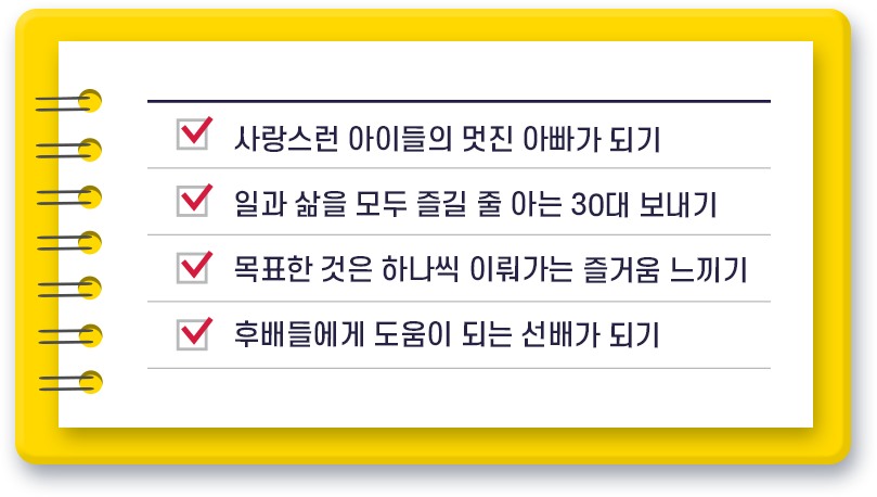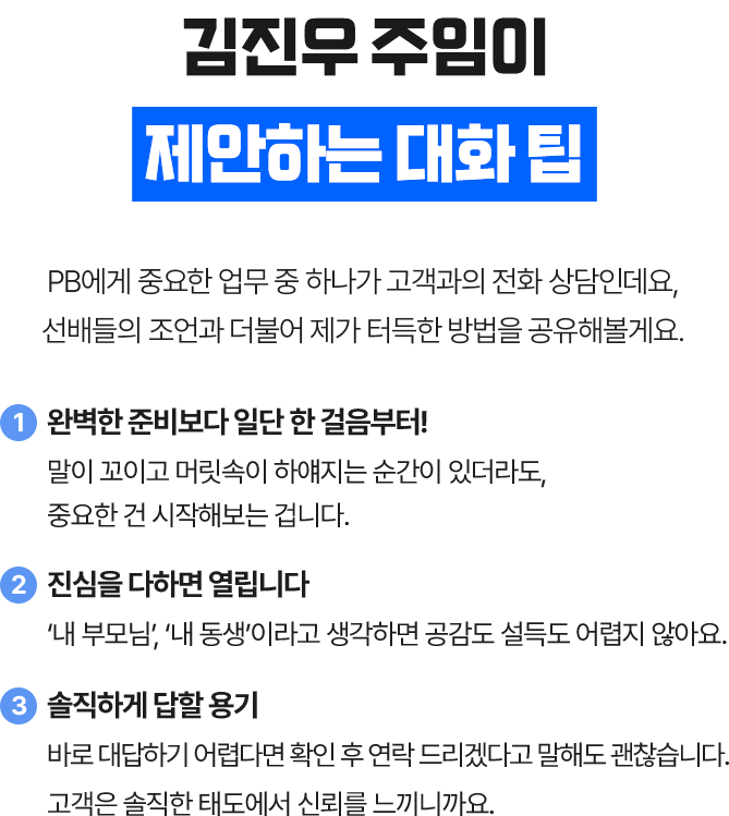 올해 제 목표는 ‘여러 방면에서 성장하기’였습니다. 그래서 선배, 동기들의 조언과 더불어 스스로 다양한 경험을 해보려고 노력했습니다. 지점 내 행사 MC를 맡기도 했었죠. 모든 경험은 반드시 배울 점을 남긴다고 믿습니다. 그래서인지 한 해를 돌아보니 아쉬움보다는 내일에 대한 기대가 더 큽니다.