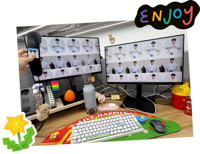 사무실 책상을 꾸몄습니다. 몇 가지 포인트가 있는데요, 첫 번째는 나를 웃게 하는 박보검의 얼굴이고요. 두 번째는 전화받을 때마다 행복한 기분을 선사하는 카피바라 키링입니다. 세 번째는 가습기 밑에서 맛있게 숙성 중인 대봉감, 마지막 네 번째는 알록달록 책상 패드예요! 제 책상 멋지지 않나요?