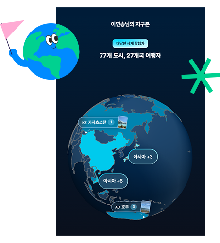 며칠 전부터 하고 있는 지구본 꾸미기, 지꾸를 소개합니다. 여행 다녀온 도시와 국가를 지구본에 추가하고 그 도시에서 쌓은 추억의 사진 3장을 추가해서 짧은 글귀와 함께 저장할 수 있어요. 다른 사람과 친구 맺기도 가능하고 친구끼리는 서로의 사진에 리액션도 가능하답니다. 새로운 꾸미기를 원한다면 지꾸 한 번 해보세요!