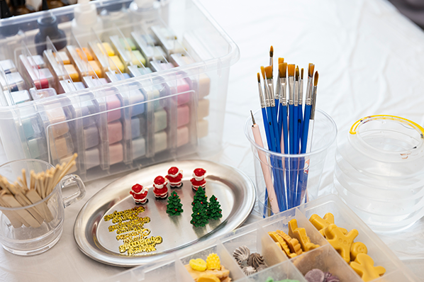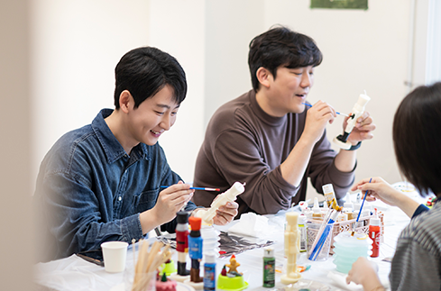 다음으로는 병정 캔들을 채색했어요. 흰색 향초에 색을 입히는 언뜻 보면 간단한 과정이지만 양초라는 재질 특성상 균일한 색을 내려면 여러 번 덧칠해야 해서 섬세하고 빈틈없는 붓질이 필요하죠. 학창 시절 이후 붓을 잡아본 게 처음이라 잘할 수 있을지 모르겠다던 참가자들이지만 막상 작업을 시작하자 말없이 붓질에 몰두하며 각자 취향에 맞는 초록 모자, 금색 모자, 빨간 모자 병정을 완성했어요.