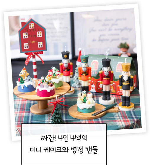 크리스마스에 캔들을 빼놓을 수 없죠. 촛불을 탁 밝히면 아늑하고 포근한 연말 분위기 완성! 환한 빛과 은은한 향이 공간을 훈훈하게 채운답니다. 오늘 만든 미니 케이크와 병정 모양 캔들은 동화 같은 크리스마스 분위기를 연출하기에도 안성맞춤입니다.