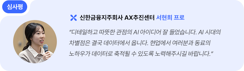 각 발표가 끝난 후에는 우수조를 선정하기 위한 현장 체감도 투표를 진행했는데요, 평가는 공감도, 구조 및 논리성, 현장 적용 가능성, 조직 기여도, 활동 집약도를 중심으로 이뤄졌습니다. 참석자들은 순위에 연연하기보다는 서로의 생각에 깊이 귀 기울이고 공감하며 지난 1년간의 고민이 담긴 결과물에 아낌없는 박수를 보냈습니다.