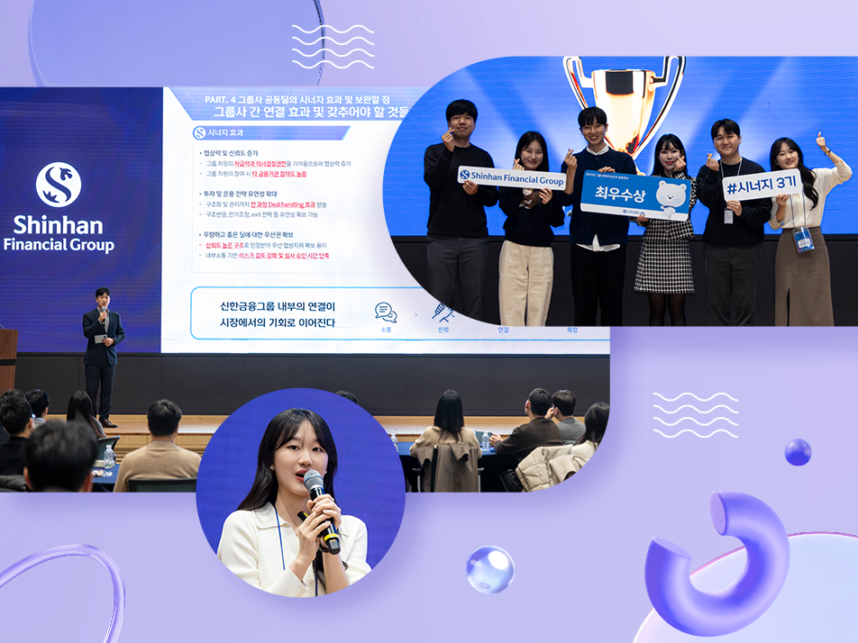 2025년 4월 시작한 그룹 변화추진조직 S-Energy(이하 시너지) 3기 활동이 8개월간의 대장정을 마무리했습니다. 지난 12월 18일 그간의 여정을 통해 집약한 아이디어를 발표하는 시너지 3기 컨퍼런스를 개최한 것입니다. 신한금융그룹은 그룹사 주니어 인재들의 네트워크 확대와 개인 역량 강화는 물론 원신한의 시너지를 통한 ‘나’와 ‘신한’의 동반성장을 목표로 시너지 3기 프로그램을 운영했는데요, 담당 직무와 관심 분야별 온라인 클래스 제공을 비롯해 총 4번의 오프라인 연수를 진행하며 참여자들이 각자의 전문성을 그룹 차원의 시각으로 확장해나가길 바랐습니다.