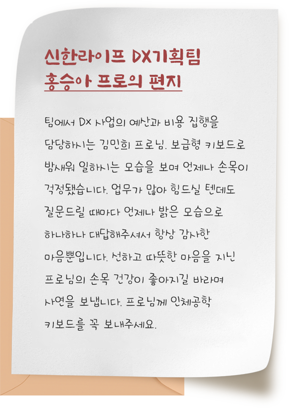 장시간 타이핑을 하다 보면 손목이 뻐근하고 욱신거릴 때가 있죠. 고마운 동료가 통증과 이별하길 바라며 신한인이 보내온 사연을 소개합니다.